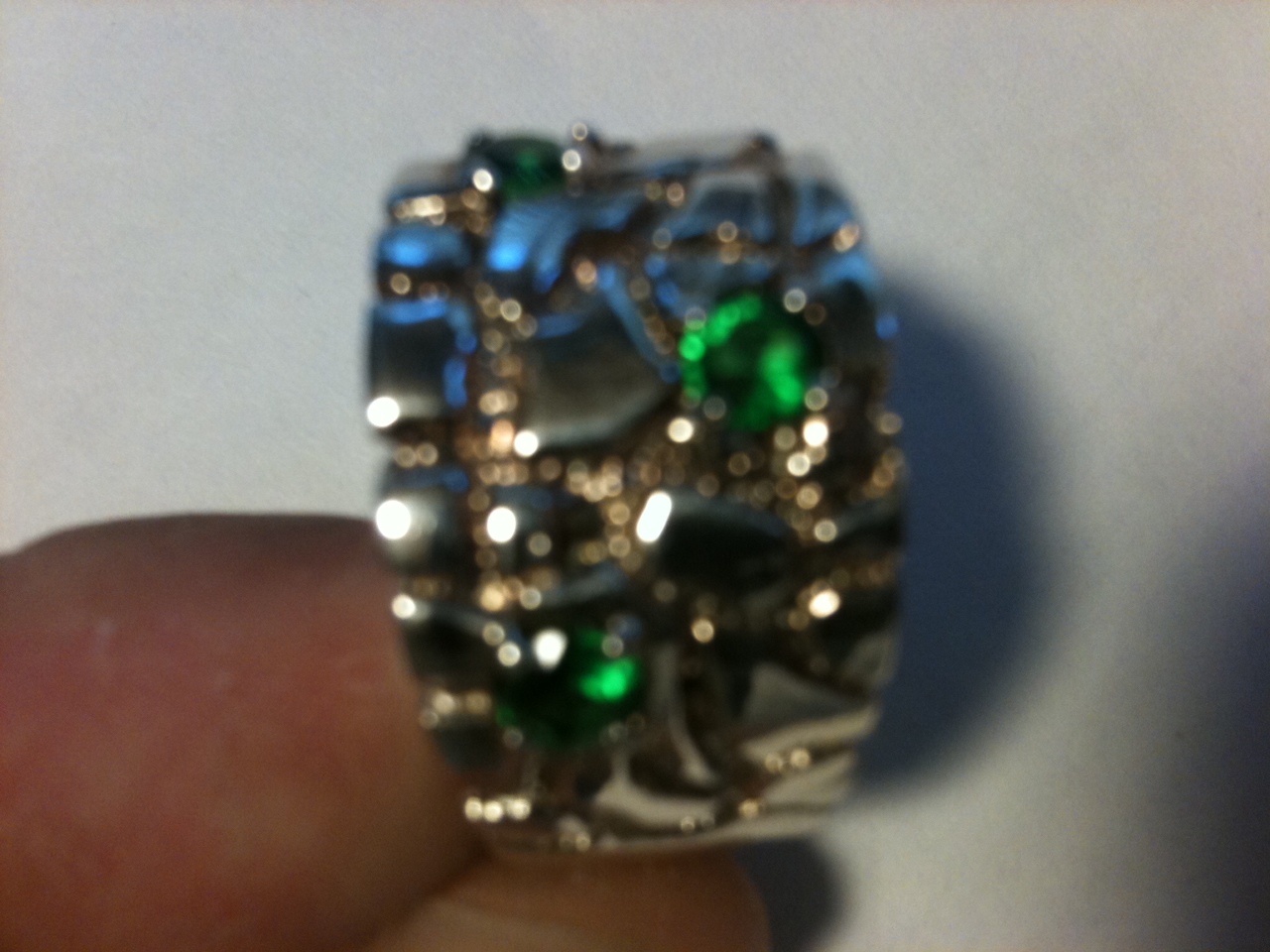 I have been blessed, because of meetings, to be at Mt. St. Helens twice in the last year. The second time, when I took the attached picture, I was able to take my family. While in the area, my wife bought me a beautiful ring with incredible green crystals. When I asked what the gems were she explained it was Mt. St. Helens Jewelry – Jewelry made from volcanic ash processed by heating at high temperatures and under tremendous pressure to cause the ash to turn to a crystallized state. These green (because of the copper) gems are then cut and polished to make the beautiful piece of jewelry shown below.