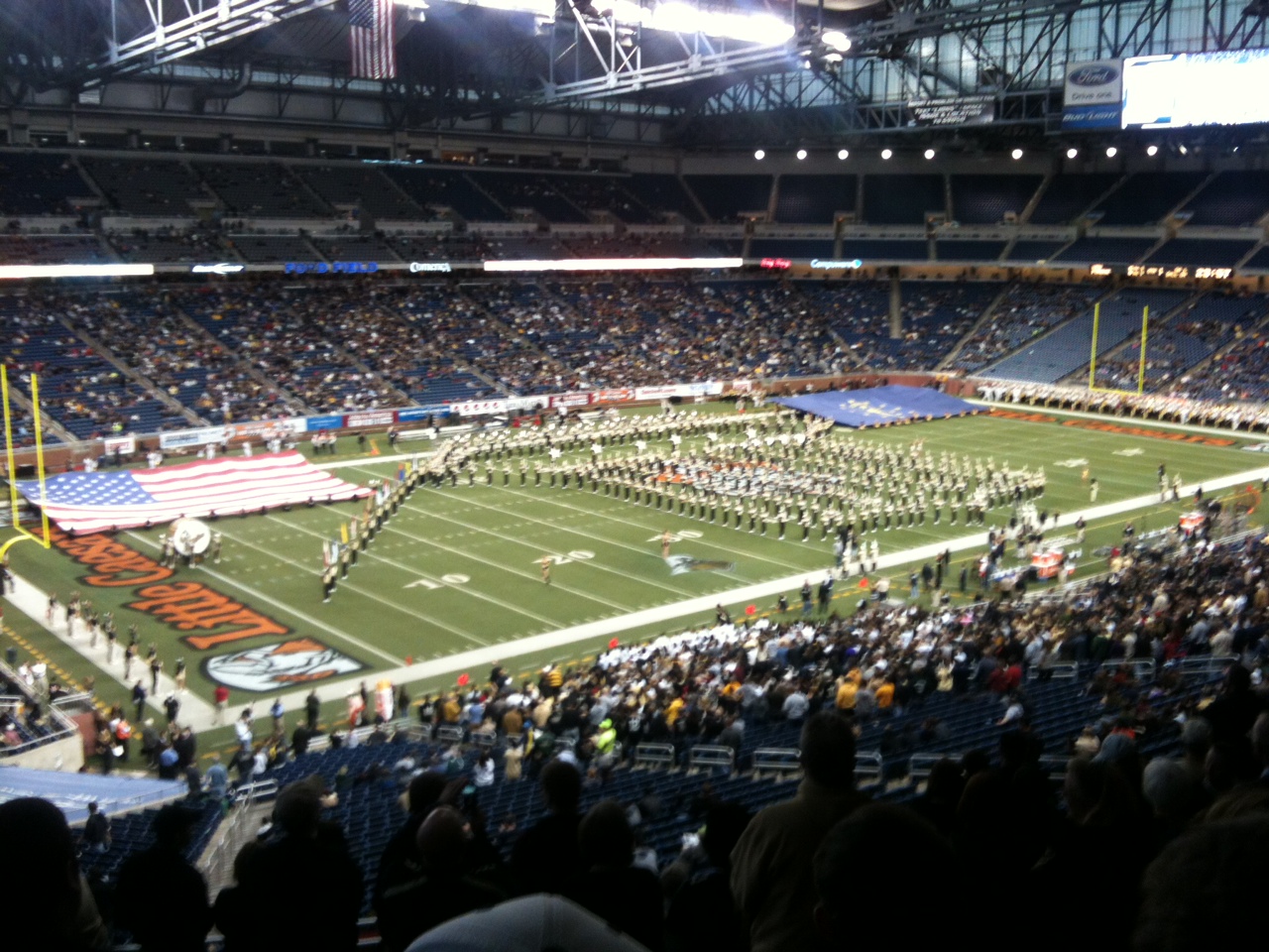 My post today, however, deals with what I consider to be one of the most moving pregame shows in the world. The Purdue University “All American Marching Band” does a show leading up to the national anthem that includes a portion called “I Am An American.” For a complete story of this show that was first done in 1966 click here. To the left is a picture of the band’s final formation in Ford Field as “I Am An American” was read. I still get goose-bumps and tears in my eyes every time it is done. Amazingly, I had a Western Michigan University fan tell me they were most looking forward to seeing the Purdue “All American Marching Band” perform. That’s pretty cool!