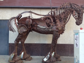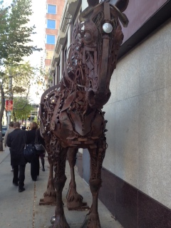 I am writing this post while in Calgary, Alberta, Canada for a conference. I am always amazed at how the littlest of events will inspire posts for my blog. Allow me to tell a story of another one of those times. With a little free time I was doing what I do best – explore and be curious. As I was exploring the streets of Calgary I came across an interesting sculpture of a horse outside Saltlik A Rare Steakhouse (I am eating there tonight). I have posted a few pictures of it in this post. It is actually a major work of art in my opinion. Basically, the artist took metal pieces of farm equipment and tools and welded them into this great representation of a horse. Really, it is amazing enough that I probably looked at it and analyzed for about an hour. Now, as a farm boy, let me tell you it is awesome!