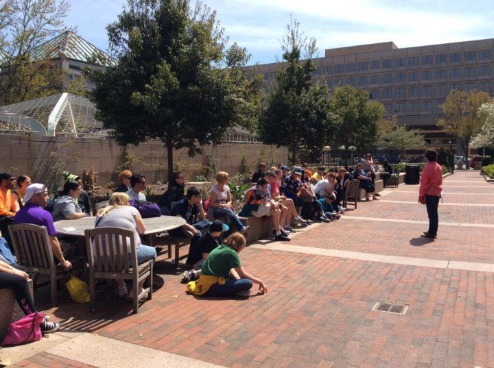 As I took a moment to become mindful, however, I decided that with a Metro station two blocks from the zoo at Woodley Park, and then a short ride with one change from the Red Line to the Orange or Blue Line at Metro Center, it would be a cheap, $2.75 per person, experience and journey for our students and families. So, what did I do? While the group was exploring at the zoo, I went and purchased 55 Metro passes. What a great experience and adventure it was! Bottom line: we all got to Enid A. Haupt Garden on time for our program (see picture below)! I had students telling me it was the greatest thing they had done. All of our participants were glad to have had the experience. What a great lesson for our students to learn how to use mass transit.