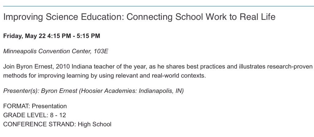 I discussed with attendees how we had partnered with AgReliant Genetics when I was teaching at Lebanon High School to provide opportunities for our students to do real world/real time research. The students were able to do this working with real researchers. This working with adults component is so very important in my opinion. To create the ideal learning environment we must have Students working in teams to experience and explore relevant, real-world problems, questions, issues, and challenges; then creating presentations and products to share what they have learned. Here is a link to my presentation: