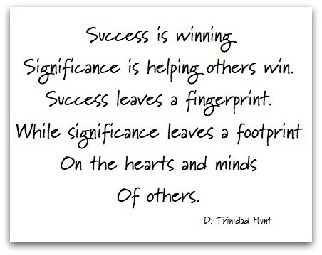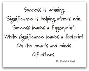I think about and discuss a lot with team members about the idea of being significant versus successful. We tend to spend so much time striving for success; position, salary, deals, great education, degrees, et cetera that we forget about being significant. Significance is really about extending the reach of our leadership far beyond ourselves. I am working very hard at this point in my life to make everything I do about lifting others up and helping them reach the personal goals and peaks of their professions they are striving for. This in turn will create another generation of leaders to be significant for others. This would be a pretty ok legacy, don’t you think?