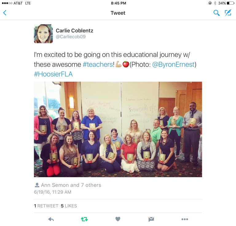 It was exciting to see a tweet from one our FLA participants, Ann Semon, after session yesterday. She said, “What an inspiring day with @ByronErnest today. Excited for the leadership journey. #HoosierFLA” I’m so glad Ann recognizes this is a journey. Then another tweet from Carlie Coblentz stated, “I’m excited to be going on this educational journey w/ these awesome teachers!” Again, I’m thrilled that Carlie recognizes this as a journey.