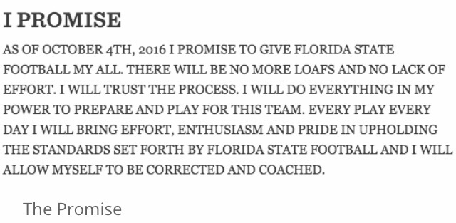 A signed copy of the promise pictured here sits in the locker of each Florida State player. After an awful start to Florida State’s season this past year, head coach Jimbo Fisher took an unprecedented step and presented his team with a promise and challenged them to sign it and live up to it.