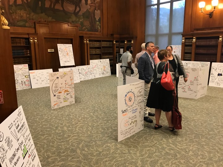 I also believe graphic recordings enrich the meeting space. Displaying the graphic recordings in the meeting space itself is one of the most effective ways to ensure the visuals are part of the ongoing discussion. People will naturally refer back to what was said — the graphic recordings serve as a tangible record in full view of everyone. Again, as I stated earlier by displaying the graphic recordings, you’re showing participants that their words and thoughts are valued and you’re encouraging people to review and discuss the content. This creates a safe environment to share ideas and conflicting opinions.