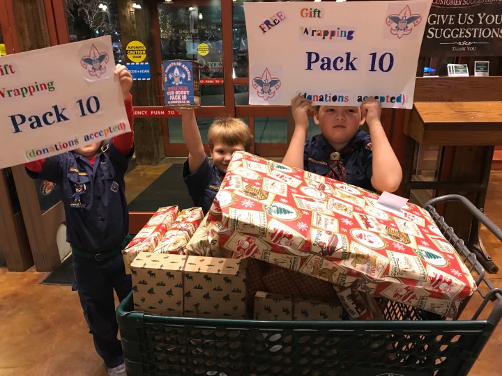 Anyway, on my way out of the last store I was approached at the door by some enterprising Cub Scouts. The boys said, “Sir, we would like to wrap any gifts you have.” Well, my prayers were answered. I proceeded to their table and said, “Can you wrap all this, plus what’s in my truck?” The boys and their moms said, “Sure!” I was sold! Of course, as they got started, I went out and got all the other gifts.