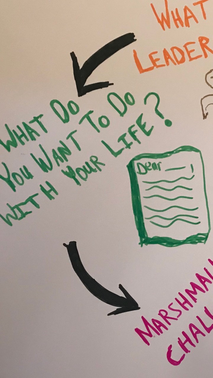 This was the catalyst for an incredible discussion. The comment and part of the discussion that most excited me was when one of our very talented young aspiring leaders said, “You know, before you told us not to think in terms of jobs, promotions, or titles, that is where I was headed. This is the first time I’ve really thought in terms of being significant and having a purpose.” Mission accomplished! The graphic recordings each participant made on the tables during this session say it all. Here are a few samples: