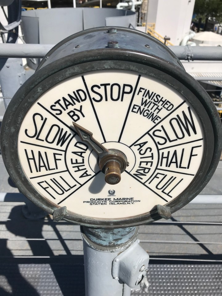 The exhibits in the museum are awesome and I had the chance to explore the entire ship. I was especially inspired in the wheel house, or bridge, as I looked out the port hole windows and thought about the decisions leaders had to make on this very deck. Then when I went above to the outdoor wheelhouse deck I studied the Engine Order Telegraph (the featured picture of this post). I immediately realized I had found another great metaphor that I believe represents the ways many organizations, leaders, associations, and governments work. Earlier last week I blogged about metaphors in Leading By Metaphor.