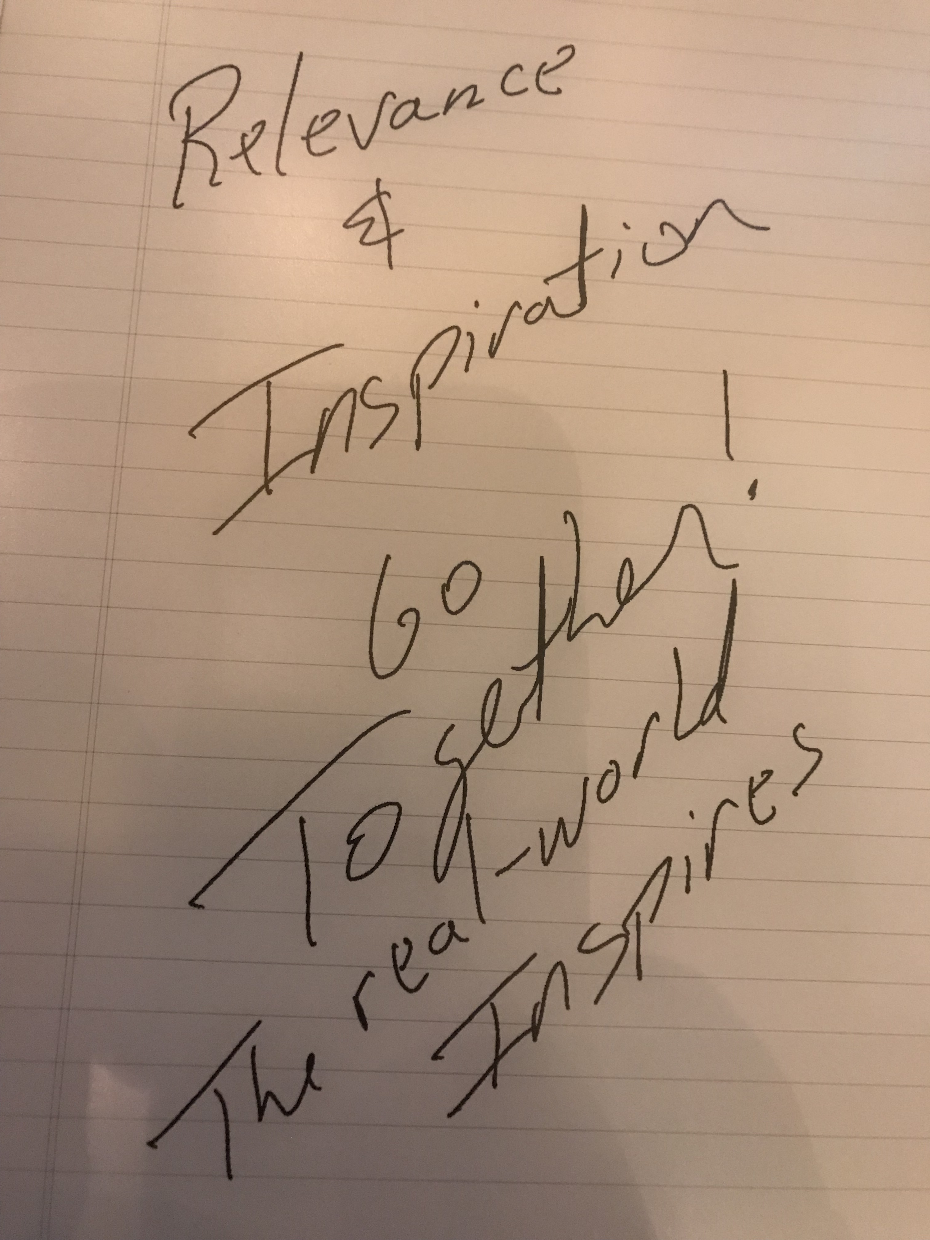 - “Relevance and inspiration go together!” – Who knew? Every scholar in every school in the world! They might not say it, although they do, when they say things like, “Why do I need to know this?” If that Hand in the Back of The Room can’t be answered there will be NO inspiration to learn. Trust me, I know because I was that student with his hand up in the back of the room almost six decades ago now.