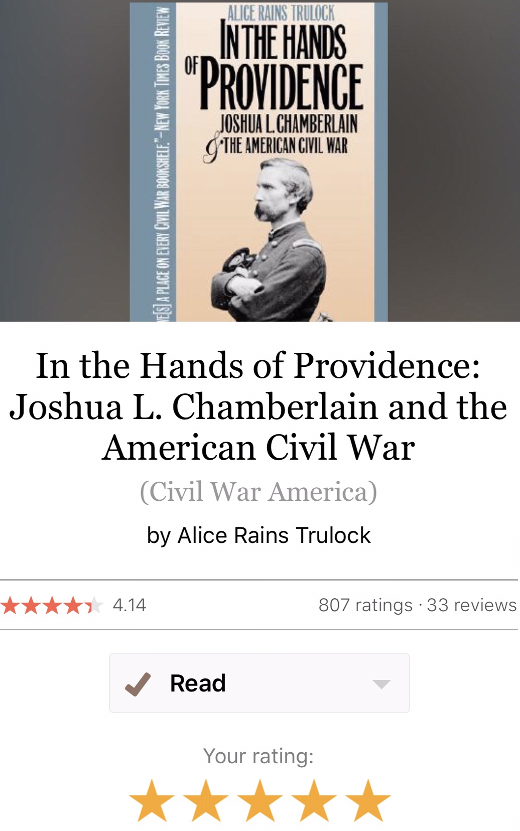 - Read the great book by Alice Rains Trulock, In The Hands Of Providence: Joshua L. Chamberlain & The Civil War. This book is awesome and I gave it five stars. Is a very well written well told story of this great leader. This book inspired me to dig deeper and explore more to understand how this man became the great leader he did, at a crucial time in our nation’s history.