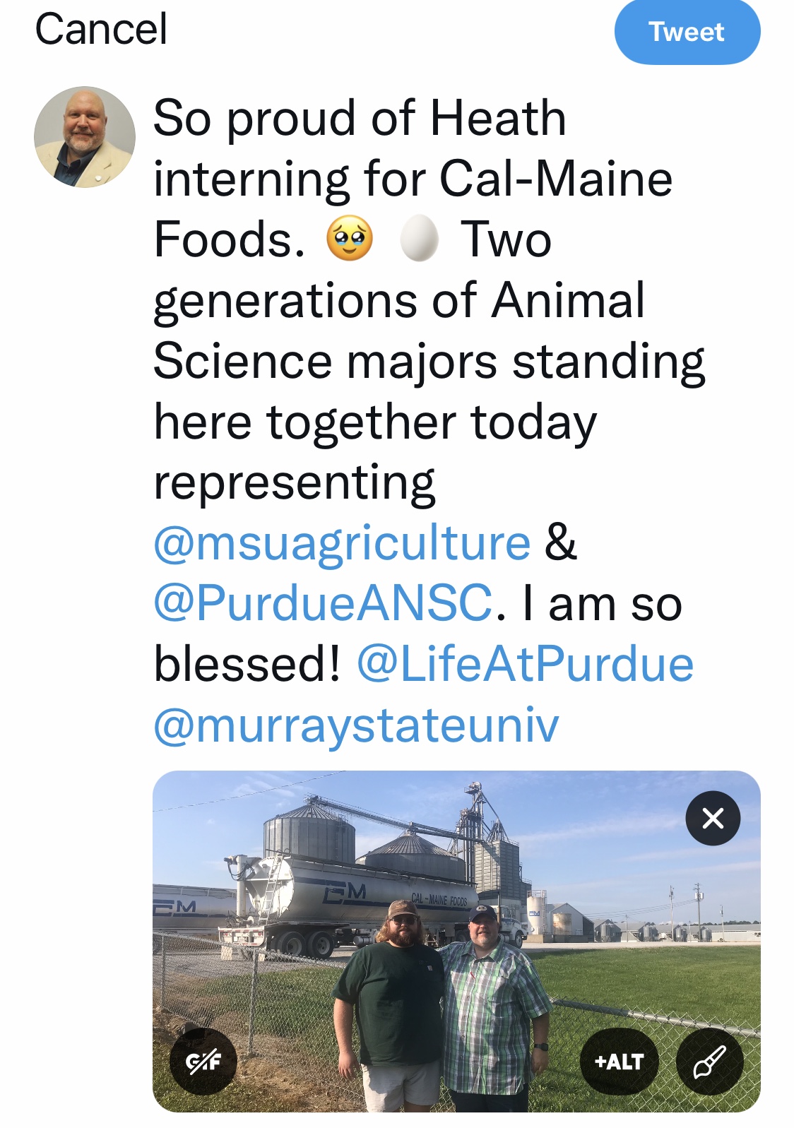 Everyone should feel satisfied and proud of the career they want to pursue. Our goal has always been for our son to make peace with his post-secondary education and career goals and, first and foremost, make himself proud. There has been quite a lot of research done studying the impact parents have on their children’s educational and career goals. I am really glad and proud of the work I have done in the policy arena to have career exploration be something that happens much earlier than the end of high school. Our young scholars need to be preparing for the next chapter of life—whether that’s higher education, industry training, directly into the workforce or another path much earlier. I also believe that parents have an influence, either positive or negative, on this. I began reflecting on this yesterday when standing outside my son’s summer internship at Cal-Maine Foods. I could not go in for bio-security reasons, but I was so proud that there stood two generations of Animal Science majors at two different universities – Purdue University and Murray State University. Check out our picture and here is the tweet I did in the moment: