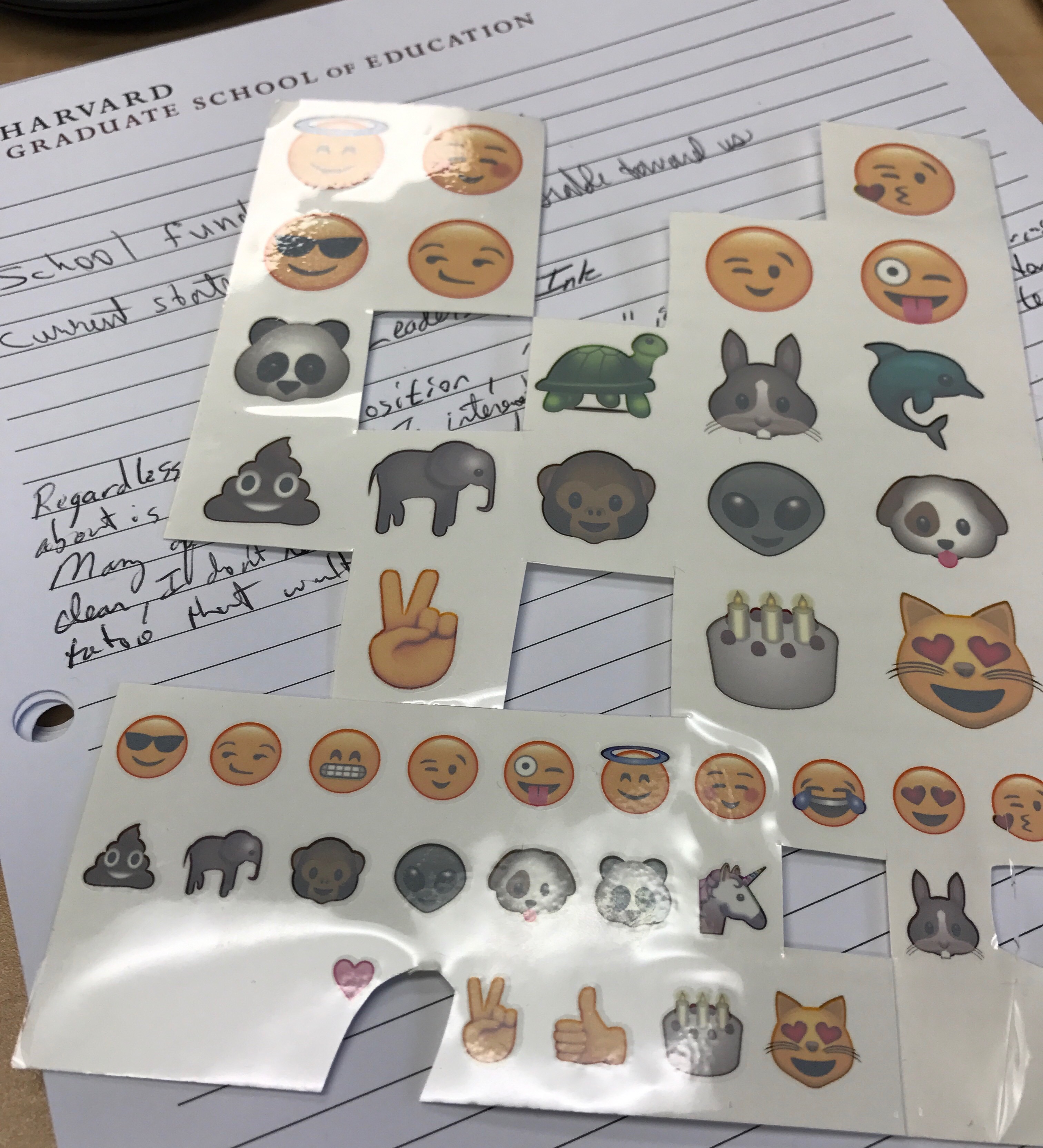 This past weekend we used Emojis as a “through line” for our Focused Leader Academy (FLA) December retreat. The first activity we did had participants pick an Emoji temporary tattoo and put it somewhere on their body. Check out the picture of the sheet of available tattoos. The catch was, you needed to explain why you picked the tattoo you did and the significance of where you placed the ink on your body. Needless to say, we had a lot of fun with this.