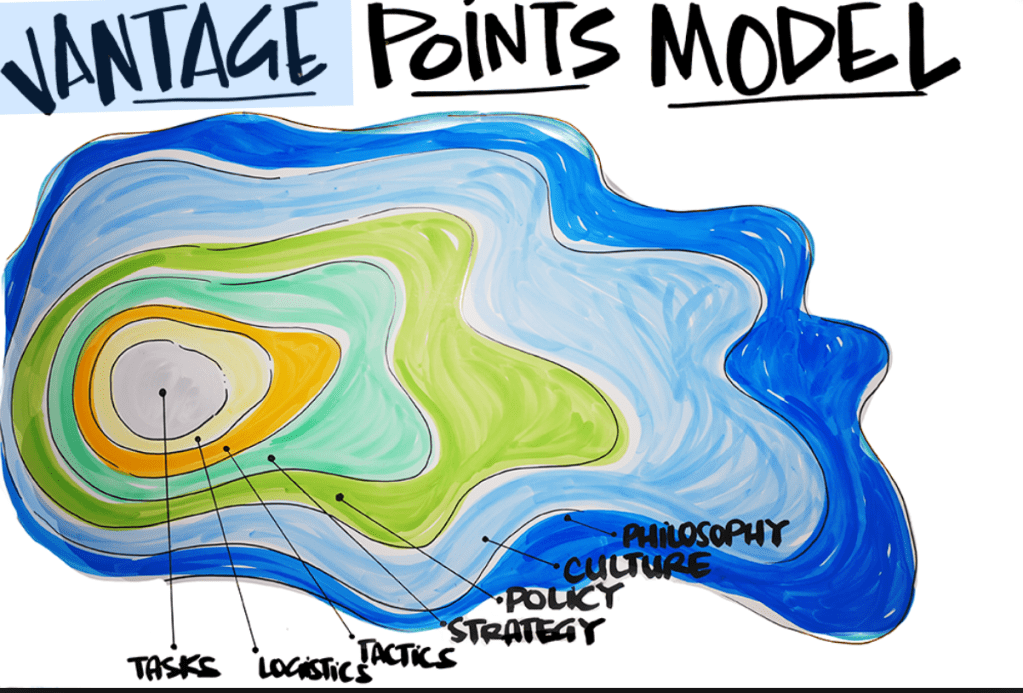 This experimentation must include using a model like the Vantage Point Model©. The experimentation must include stakeholder representation from the organization related to philosophy, culture, policy, strategy, tactics, logistics, and tasks. I teach this model in all leadership development work I do. I truly believe and have witnessed it to be true that if all seven stakeholder groups are represented, change has a great chance of success. Additionally, I have seen failure, particularly in the area of technology, when the stakeholders involved with tactics, logistics, or tasks are not included in the experimentation.