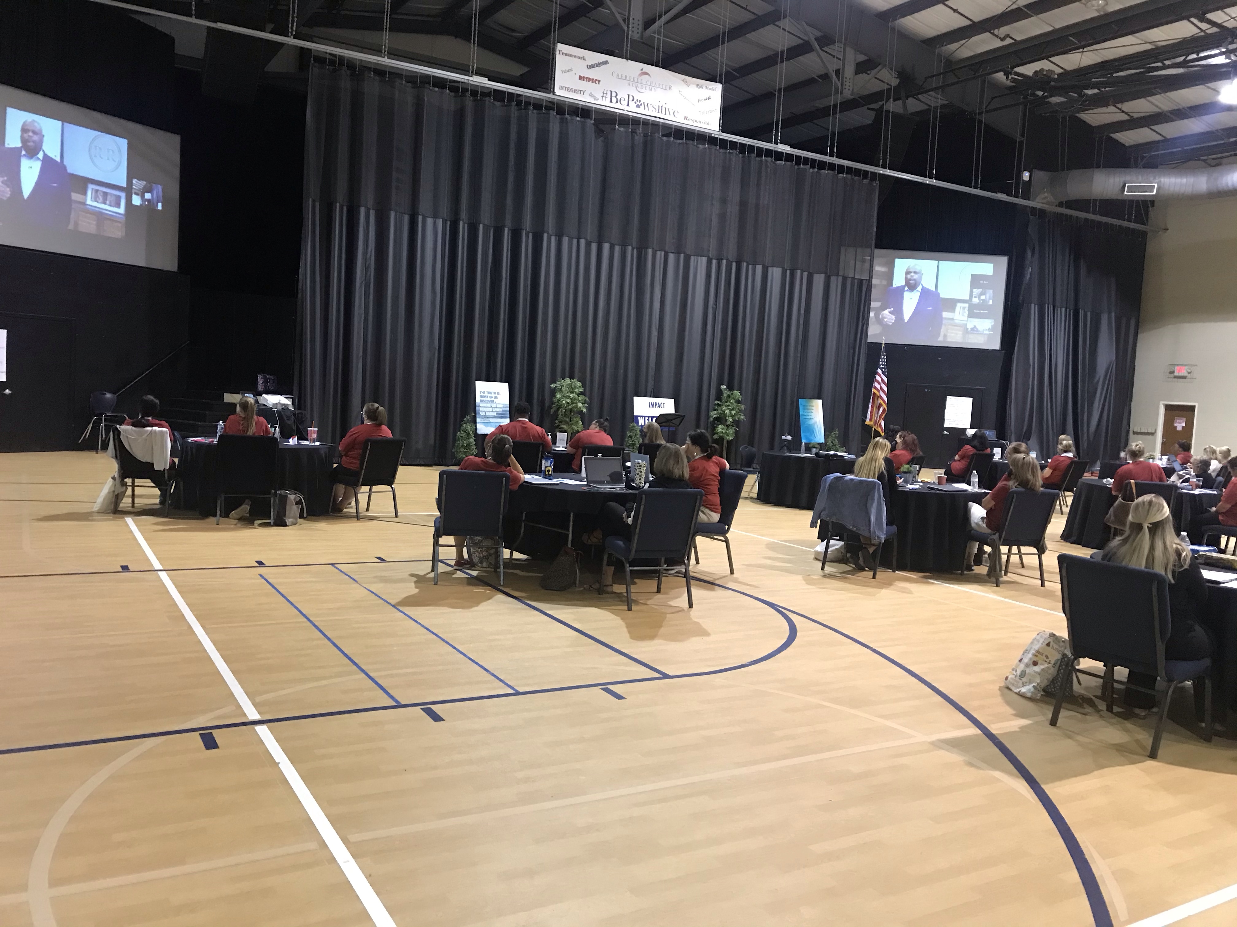 Yesterday, the perfect opportunity for serendipity occurred as we were setting up for our Impact Georgia teacher professional development. We had two big screens on either side of the stage and a screen on the stage in the middle that was not going to work, but could not be taken down. There was a group of four of us looking at the stage. I said, “Do we have any good looking banners we could drape over it?” Everyone thought and we couldn’t think of any. Then a couple of other ideas were thrown out. Both good options. But, a fourth option then came in the form of a question: “could one of the stage curtains be positioned to just cover the middle part of the stage leaving the side screens visible?” We went to work and found the answer to be “yes!” Serendipity!