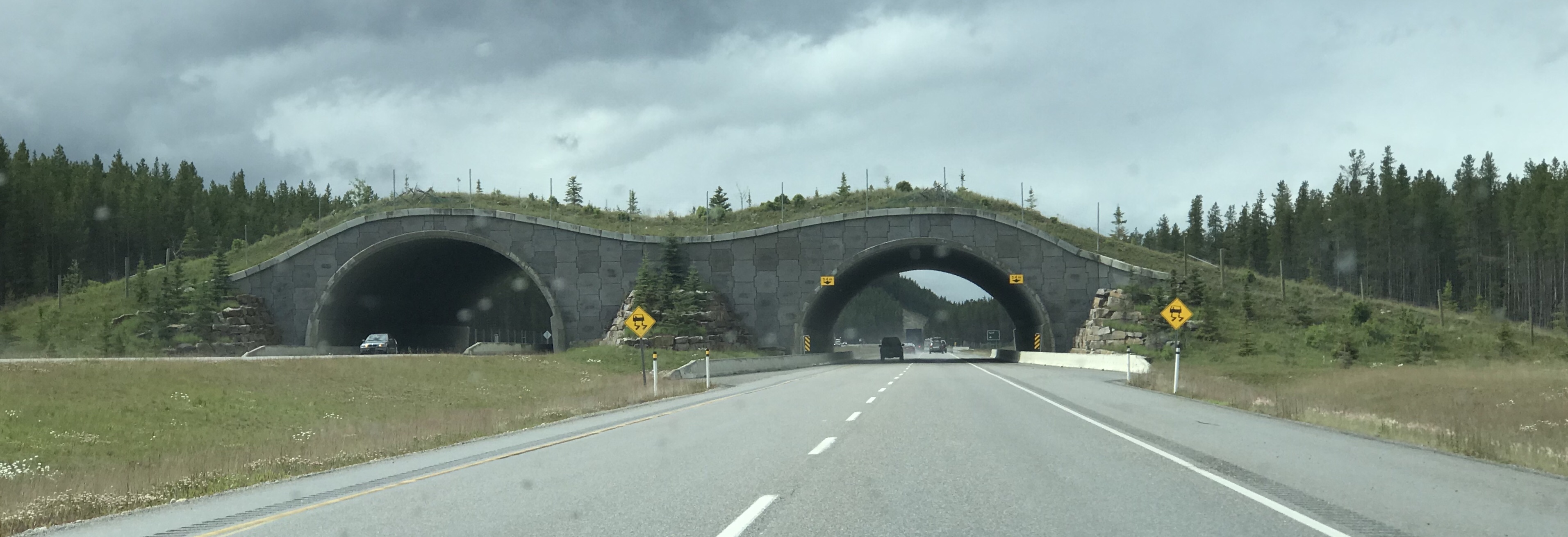 Yesterday, in Banff National Park Of Canada I learned that they are doing extensive studies on saving wildlife and reducing accidents on the Trans Canada Highway. They are fencing along the road and have built overpasses and underpasses for the wildlife to cross the interstate. Genius! Accidents and wildlife injuries have been reduced. Interestingly, they have found that black bears and cougars like to cross in the underpass and grizzly bears like to use the overpassed. You’ll find a picture of the overpass before this paragraph and a picture of the fencing here: