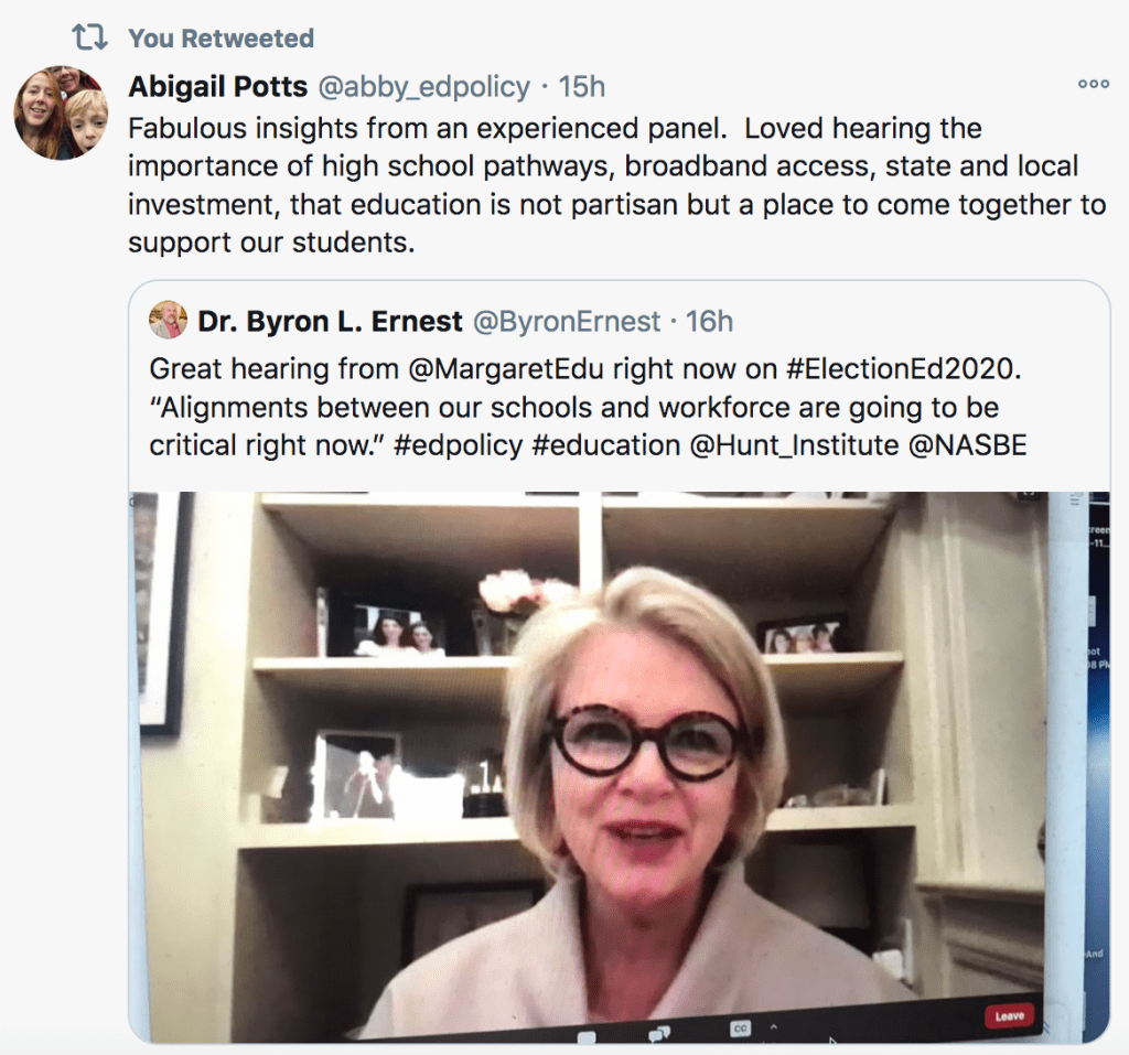 Secretary Margaret Spellings reminded us that education must be a major component of any pandemic recovery plan. As she said, “Education must be on the first train out of Washington.” And, she also reminded us that in order for there to be economic recovery, education must be involved. As a person who believes so much in the involvement of business/industry in education it gave me hope when she suggested that “Alignments between our schools and workforce are going to be critical right now.” This also includes continued alignments with higher education for all of dual credit, dual enrollment, Advanced Placement, internships, and work-based learning opportunities. We cannot let the pandemic take these away from our students. These opportunities provide for some of the greatest outcomes being afforded our students. I loved that Abigail Potts, NASBE’s Director of College, Career, and Civic Readiness, retweeted my tweet on this with comments that added the importance of our high school pathways, broadband access, and state and local investment. And, Abby pointed out in that tweet that education is not partisan but a place to come together to support our students. Thanks for the tweetversation (yes, I just made up a word), Abby!