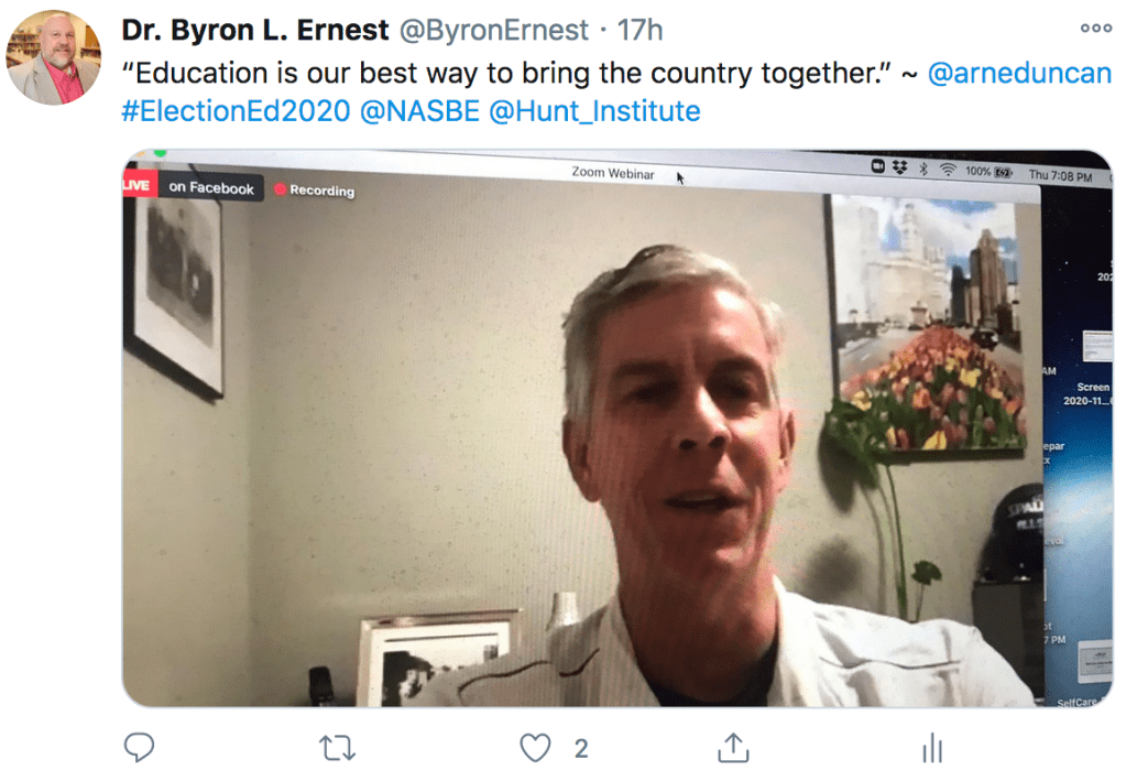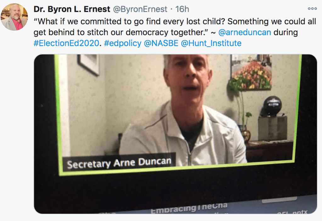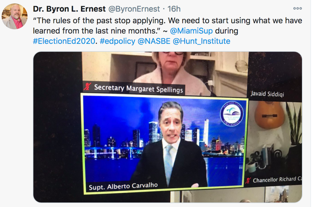Last evening I had the opportunity to do some of what I call #LearningTogetherApart. Yesterday was Day 245 of the Global Pandemic and the webinar was entitled “Post-Election 2020: Charting a Path Forward in Education.” The webinar was put on by The Hunt Institute and the National Association of State Boards of Education (NASBE), which I am chair of the board for, was one of the partner organizations involved in making this conversation possible. Other partners were The School Superintendents Association, National Association of Elementary School Principals, National Association of Secondary School Principals, and National School Boards Association. And, what a great conversation it was. The panel included The Honorable Margaret Spellings, Former U.S. Secretary of Education (2005-2009), President & CEO Texas 2036; The Honorable Arne Duncan, Former U.S. Secretary of Education (2009-2015), Managing Partner, The Emerson Collection; Chancellor Richard A. Carranza, New York City Department of Education (2018-Present); and Superintendent Alberto Carvalho, Miami-Dade County Public Schools (2008-Present). As you can see this was quite the lineup of experience and expertise in the room.