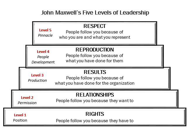 First of all, the group talked about how great it is that we continue to move from forms of power to levels of what John Maxwell called 5 Levels of Leadership. The group acknowledged how negative most of the five levels of power are, but that those powers exist, how they can be used for positive, and how we should use them for creating positive environments. One of the positive forms of power is “referent.” I have blogged about this power before in The Majestic Leader. Also, here are Maxwell’s 5 Levels of Leadership: