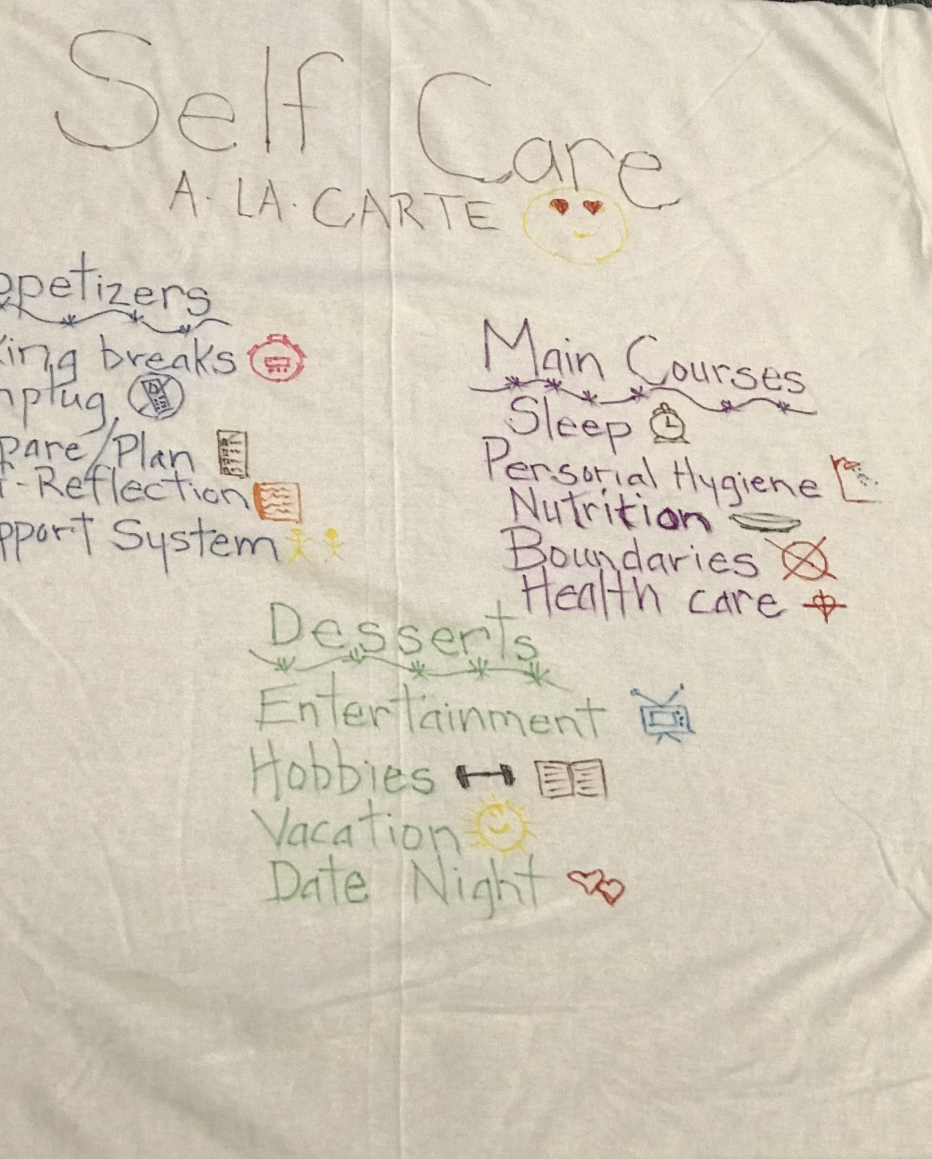 The point was that we don’t have to spend every moment processing and transforming every moment like becoming a French fry. To be the whole person and stay like the potato we need to make sure and schedule time for what another group called “Self Care A La Carte. Check out their list of a la carte self care items on their t-shirt: