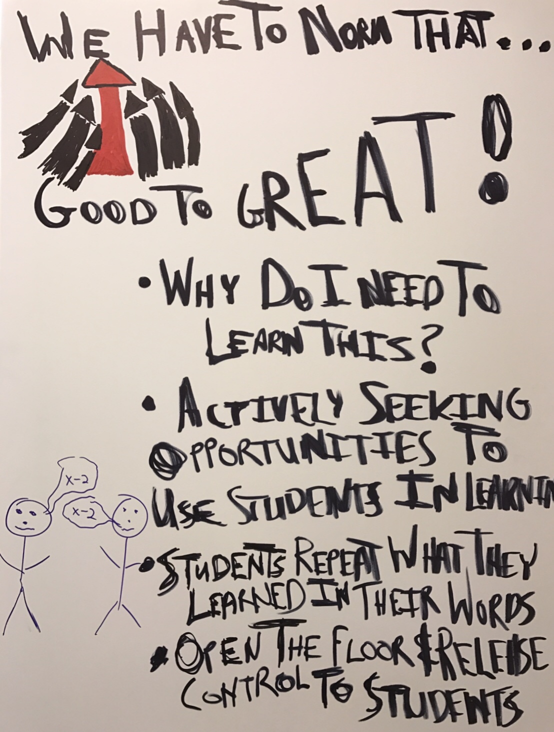 When students make the connection from true engagement, they begin to understand that lessons and tasks are worthwhile because they help them meet personal goals they have begun to set for themselves, not just the teacher’s goals for them. Engagement and relevancy enable students to own their own learning. One of the activities that I had the Mevers School of Excellence teachers do during a professional development I conducted was to develop their own definition for student engagement and relevancy. To culminate their work, they developed a graphic recording of their definitions. Here’s the deal: If we want students engaged we must have students working in teams to experience and explore relevant, real-world problems, questions issues, and challenges; then have them create presentations and products to share what they have learned. Student motivation comes from lessons facilitated utilizing and encouraging student creativity, innovation, and problem solving. I have attached pictures here of their awesome work: